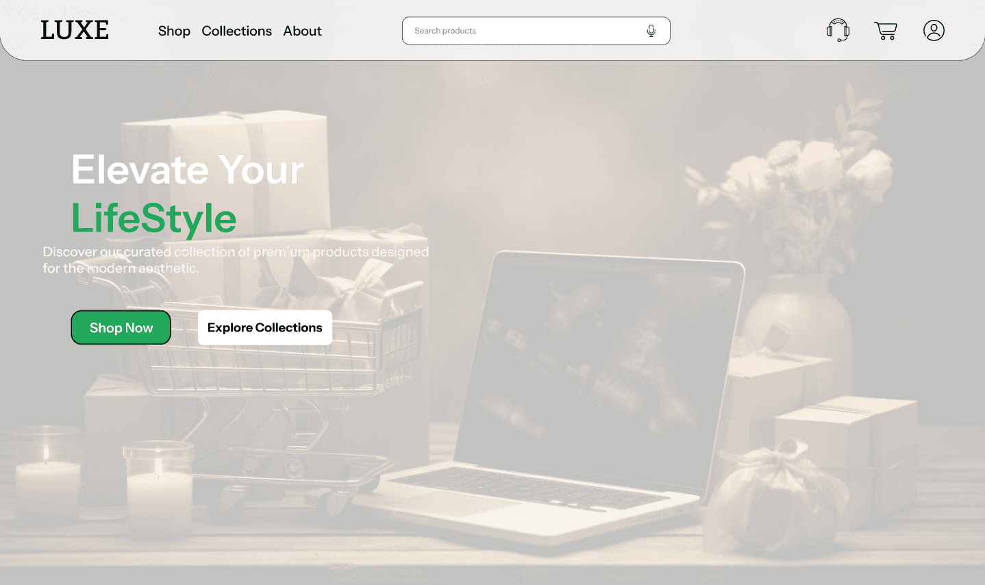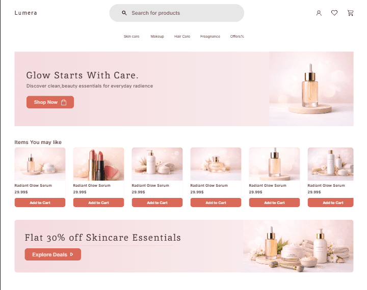 Clean layout guides users from hero section to categorized products, ensuring intuitive browsing, strong hierarchy, and reduced cognitive friction.